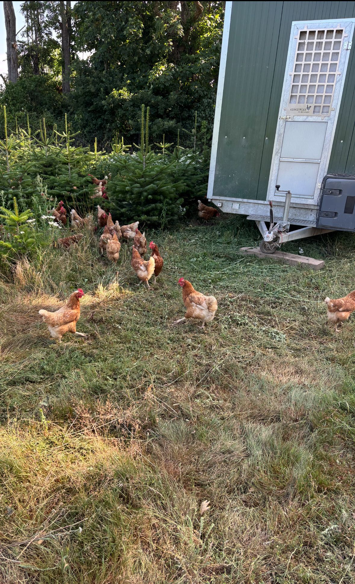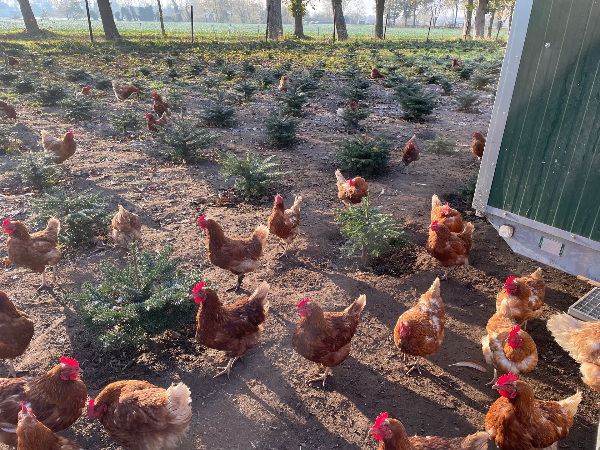 Unsere Hühner laufen in unserer Tannenbaumkultur, dies hat Vorteile für beide Seiten, die Hühner sind durch die Bäume vor Greifvögeln geschützt und die Hühner halten das Unkraut zwischen den Bäumen klein.